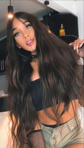 Haare:brünett, rückenlang, wellig